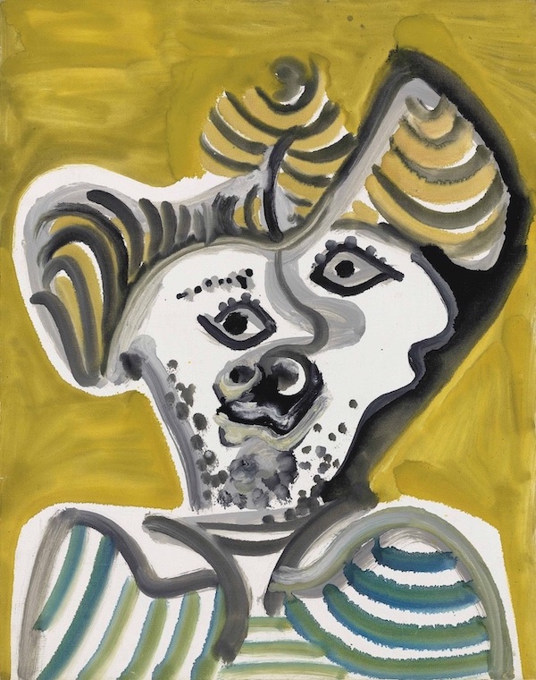 . It belongs to Picassos period of distorted depictions with its oversimplified outlines and contrasted colors resembling early cubism.